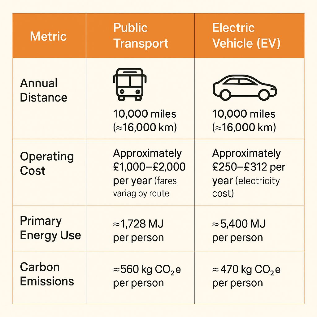 - Energy Use: An EV “uses more” total energy per vehicle (8,640 MJ per year); even when you share that burden among 1.6 occupants it comes out higher on a per–person basis 1500 kWh (~5,400 MJ) compared with efficient, well–occupied public transport 480 kWh (≈1,728 MJ), about 70% less energy needed than an EV. However, when public transport is underutilized, its energy efficiency per passenger worsens substantially, but remains a third lower than an EV.