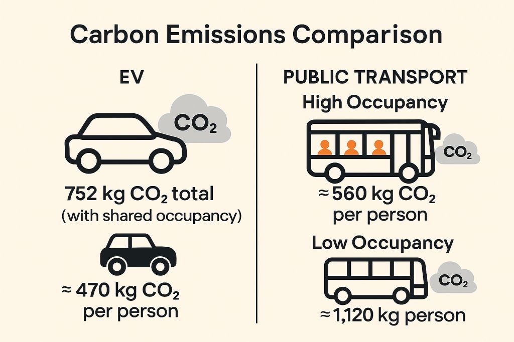 - Carbon Emissions: Under conditions of high occupancy, public transport’s low per–passenger emissions (≈560 kg CO₂e) compare fairly well with a shared EV (≈470 kg CO₂e). In contrast, off–peak or underused public transport may incur roughly double the per–passenger emissions. Additionally, the choice of green energy suppliers or the use of solar panels by EV owners can further tilt the balance in favor of EVs, reducing their carbon footprint to near-zero levels.