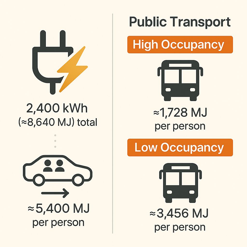 - Public Transport: Here the per–passenger energy depends strongly on how full the service is. Consider two scenarios: