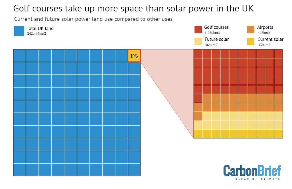 Golf courses in Great Britain occupy ~118,000 hectares of land (Ordnance Survey, UK golf industry data);  five to six times the land used by solar farms.